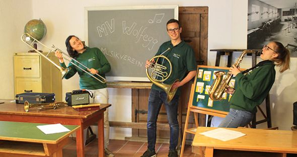 Am 18. Mai konnten die Besucher des Familientags zum Thema Musik im Bauernhausmuseum aus dem dort nachgebauten Klassenzimmer fröhliches Gelächter und die Töne verschiedener Instrumente hören. Der Musikverein Wolfegg stellte dort den Kindern die Instrumente eines Blasorchesters vor. Besonderen Gefallen fanden die jungen Nachwuchsmusiker am Musikquiz und natürlich am Ausprobieren der Instrumente. Jugendleiterin Claudia Knab erklärte gemeinsam mit unseren Musikanten Jakob Nold, Maren Hirschbühler und Antonia Schröder wie der Hase läuft. Und so konnte am Ende jeder ein paar Töne spielen. Gar nicht so einfach, aber es stellten sich auch ein paar echte Talente heraus! - Ein lustiger Tag für alle Beteiligten.